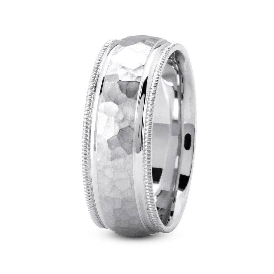 18K White gold 7mm hand made comfort fit wedding band with wide hammered and milgrain design
