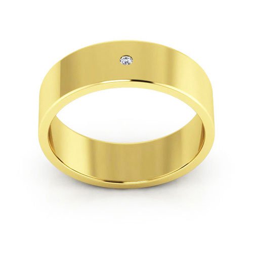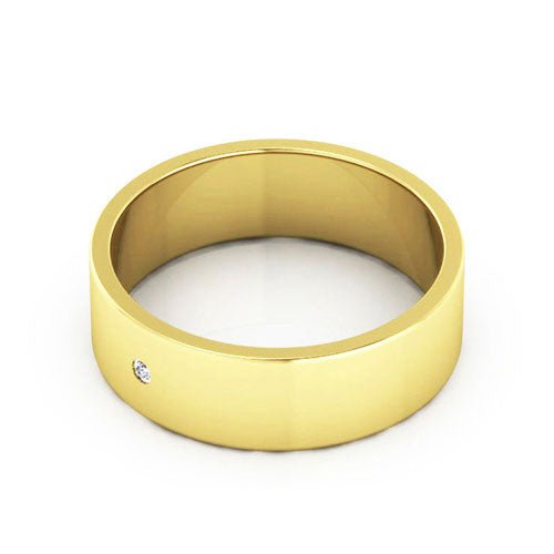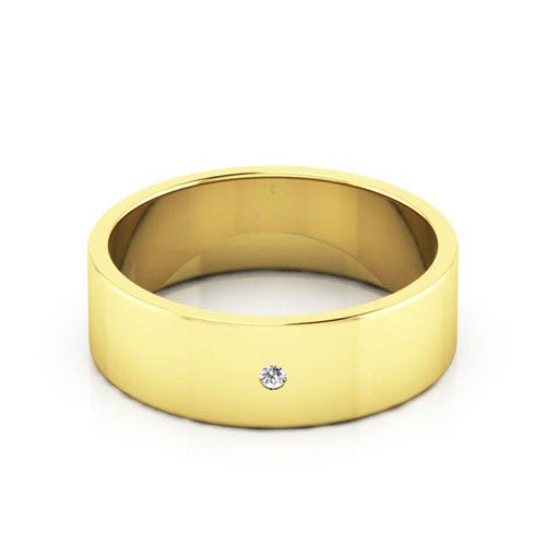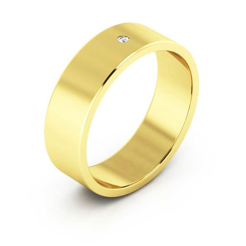 18K Yellow Gold 6mm flat men's & women's wedding band . 1 round diamond total weight of 0.01 carat. Color is G-H and Clarity is I.