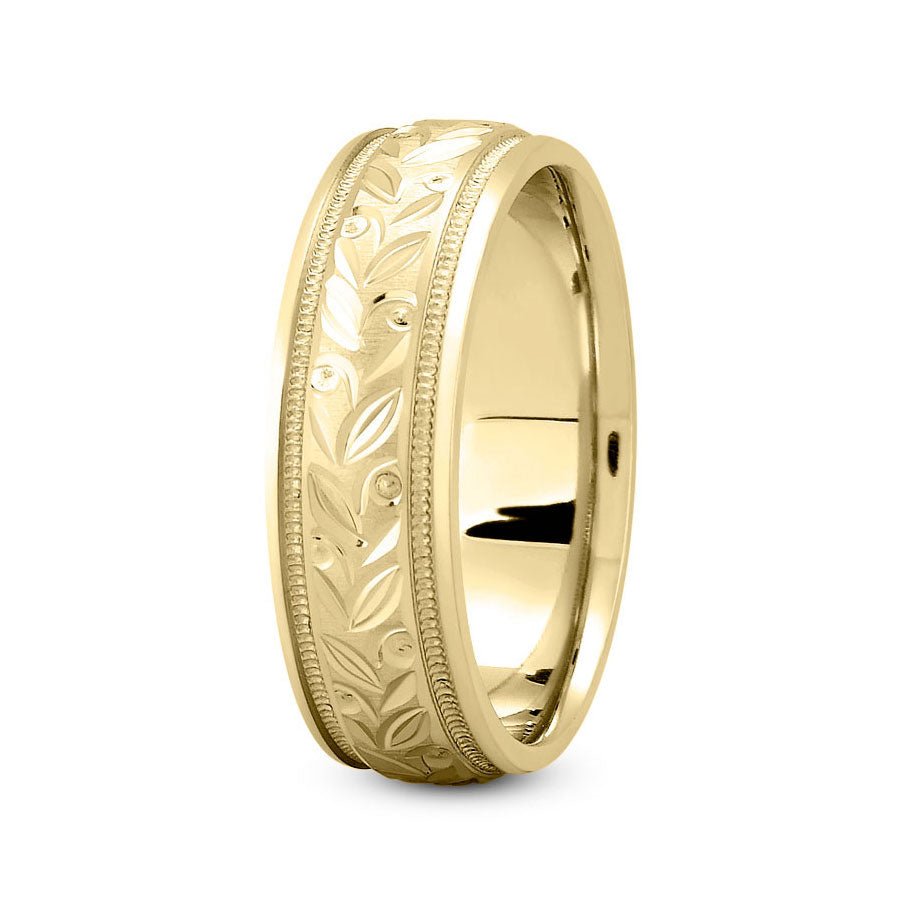 18K Yellow Gold 7mm fancy design comfort fit wedding band with wide leaf and milgrain design