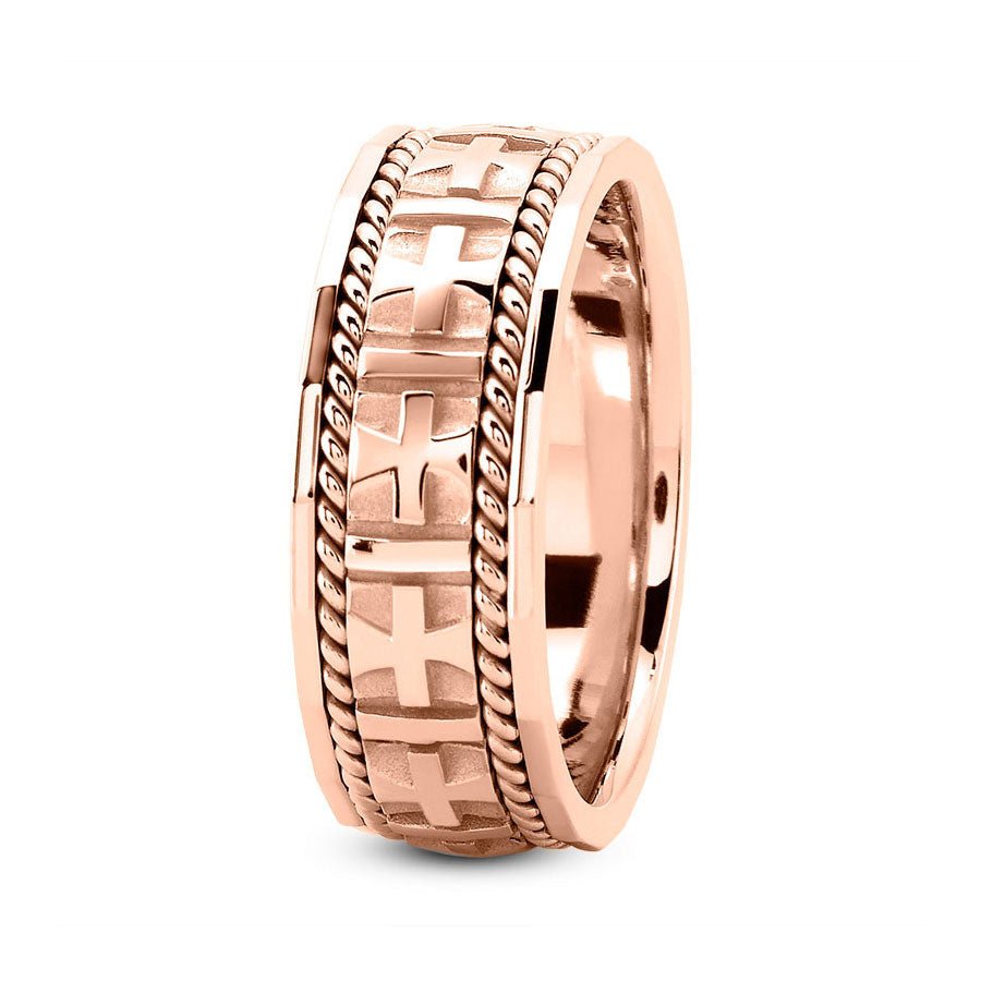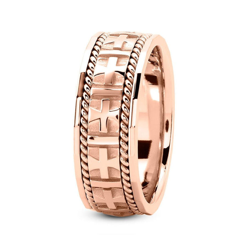 14K Rose Gold 8mm fancy design comfort fit wedding band with cross and rope design