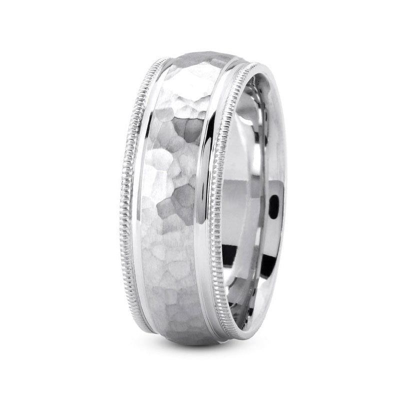 14K White gold 7mm hand made comfort fit wedding band with wide hammered and milgrain design